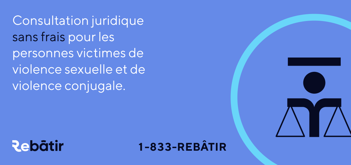 Ce service confidentiel est offert par des avocats et avocates de l’aide juridique. Communiquez avec eux au 1-833-REBÂTIR ou par courriel au projet@rebatir.ca